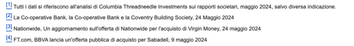 Gli spread si sono ristretti in tutto l'indice delle obbligazioni societarie, anche se nel settore bancario la contrazione non è stata così pronunciata come in altri settori che offrono un valore relativo modesto. Le valutazioni delle obbligazioni Additional Tier 1 (AT1) o degli strumenti contingent convertible (CoCo bond) appaiono relativamente elevate rispetto all'indice high yield, ma ravvisiamo ancora un certo valore nei titoli Tier 2 e nel debito bancario senior. Da ultimo, si è riaccesso di recente l’interesse per le attività di fusione e acquisizione (M&A), a fronte di una maggiore facilità di copertura dei costi del capitale per le banche, oltre a prospettive economiche più certe e a una maggiore chiarezza sulla qualità degli asset. I dirigenti aziendali prevedono ormai uno scenario di tassi più bassi e cercano di proteggere i conti economici rivedendo le leve di costo e creando maggiori economie di scala. In Europa, le operazioni di M&A transfrontaliere rimangono una sfida vista l'incompiutezza del processo di unificazione bancaria e la mancanza di un fondo comune di garanzia dei depositi e della fungibilità di capitale e finanziamenti. Le ultime operazioni si concentrano sui mercati M&A interni, dove le sinergie di costo sono maggiori: nel Regno Unito, con Coventry Building Society che ha acquisito Coop Bank[2] e Nationwide che sta acquisendo Virgin Money (in attesa dell'approvazione delle autorità di regolamentazione[3]), o in Spagna tra BBVA e Banco Sabadell (benché l'operazione debba ancora essere approvata dagli azionisti e dalle autorità di regolamentazione)[4].