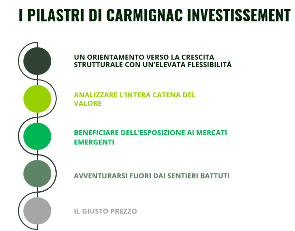 Il presente documento non può essere riprodotto, totalmente o parzialmente, senza la previa autorizzazione della Società di gestione. Il presente documento non costituisce né un’offerta di sottoscrizione né una consulenza di investimento. Esso non intende fornire consulenza fiscale, giuridica o contabile e non deve essere utilizzato in tal senso. Il presente documento viene fornito unicamente a scopo informativo e non deve essere utilizzato per valutare la convenienza di un investimento in titoli o partecipazioni in esso illustrati né per qualsivoglia altra finalità. Le informazioni contenute nel presente documento possono essere parziali e possono essere modificate senza preavviso. Esse sono aggiornate alle data di redazione del presente documento e sono tratte da fonti proprietarie e non proprietarie ritenute affidabili da Carmignac. Non sono necessariamente esaustive o accurate. Di conseguenza, Carmignac, i suoi dirigenti, dipendenti o agenti non ne garantiscono l’accuratezza o l’affidabilità e declinano ogni responsabilità in caso di errori e omissioni (compresa la responsabilità verso terzi in caso di negligenza). Le performance passate non sono un'indicazione delle performance future. Le performance sono calcolate al netto delle spese (escluse eventuali commissioni di ingresso applicate dal distributore). Il rendimento può aumentare o diminuire a causa di oscillazioni valutarie per le quote senza copertura valutaria. La decisione di investire in detto fondo dovrebbe tenere conto di tutti i suoi obiettivi e le sue caratteristiche descritte nel relativo prospetto. Il riferimento a titoli o strumenti finanziari specifici è riportato a titolo meramente esemplificativo per illustrare titoli attualmente o precedentemente presenti nei portafogli dei Fondi della gamma Carmignac. Tale riferimento non è volto pertanto a promuovere l’investimento diretto in detti strumenti né costituisce una consulenza di investimento. La Società di Gestione ha la facoltà di effettuare transazioni con tali strumenti prima della pubblicazione della comunicazione. I portafogli dei Fondi Carmignac possono essere modificati in qualsiasi momento. Il riferimento a titoli o strumenti finanziari specifici è riportato a titolo meramente esemplificativo per illustrare titoli attualmente o precedentemente presenti nei portafogli dei Fondi della gamma Carmignac. Tale riferimento non è volto pertanto a promuovere l’investimento diretto in detti strumenti né costituisce una consulenza di investimento. La Società di Gestione ha la facoltà di effettuare transazioni con tali strumenti prima della pubblicazione della comunicazione. I portafogli dei Fondi Carmignac possono essere modificati in qualsiasi momento. Il presente documento non è rivolto a soggetti in giurisdizioni dove (a causa della nazionalità, residenza o altro di tale soggetto) il documento o la disponibilità di tale documento sono vietati. I soggetti ai quali si applicano tali divieti non devono avere accesso al presente documento. L’imposizione fiscale dipende dalla situazione del singolo investitore. I Fondi non sono registrati per la distribuzione al dettaglio in Asia, Giappone, Nordamerica e Sudamerica. I Fondi Carmignac sono registrati a Singapore nel quadro del regime estero limitato (rivolto esclusivamente a clienti professionali). I Fondi non sono registrati ai sensi del Securities Act statunitense del 1933. I Fondi non possono essere offerti o venduti, in maniera diretta o indiretta, a beneficio o per conto di una “U.S. Person” secondo la definizione della normativa statunitense Regulation S e FATCA. I rischi, le commissioni e le spese applicate sono descritti nel KID (documento contenente le informazioni chiave). Il KID deve essere consegnato al sottoscrittore prima della sottoscrizione. Leggere il KID prima della sottoscrizione. I Fondi non sono a capitale garantito e gli investitori possono perdere parte o tutto il loro capitale. I Fondi presentano un rischio di perdita di capitale.Carmignac Investissement è un fondo comune di investimento disciplinato dalla legge francese (FCP), conformi alla Direttiva UCITS o AIFM. La Società di gestione può interrompere la promozione nel Suo paese in qualsiasi momento. In Italia: I prospetti, KID e rapporti di gestione annuali del Fondo sono disponibili sul sito www.carmignac.com/it-it