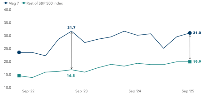 Fonte: FactSet. Il rapporto prezzo/utili (P/E) atteso è calcolato dividendo il prezzo delle azioni per le stime di consenso sugli utili attesi a 12 mesi. Il rapporto P/E atteso dei Magnifici 7 è la media ponderata per capitalizzazione di mercato. Dati al 30 settembre 2025.