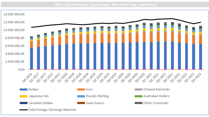 Nell’ultimo anno inoltre, sempre osservando i numeri, si è registrata una riduzione dell'8% di tutte le riserve detenute alla fine del 2022 rispetto all'importo registrato alla fine del 2021. Data la sua importanza relativa nel totale delle riserve, il dollaro ha contribuito maggiormente a questo calo (8,66%). Ma anche le riserve in euro sono diminuite del 8,5%, così come tutte le altre grandi valute (ad eccezione del franco svizzero che ha registrato un forte aumento pari a +21,74%). Il calo subito dallo yuan è stato dell’11,51%.