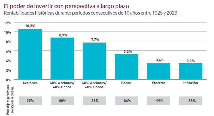 La nostra esperienza degli ultimi 100 anni ci ha insegnato che adottare una visione a lungo termine ci permette di mettere da parte il rumore e concentrarci su quelle informazioni che si allineano con gli obiettivi dei nostri clienti. Dal 1924, la nostra filosofia come investitori a lungo termine è stata una parte integrante del nostro processo di investimento, e la solidità del nostro team di analisi ci dà la convinzione e la pazienza necessarie per lasciare che le idee di investimento diano i loro frutti nel tempo. La storia dimostra che il tempo può essere il miglior alleato degli investitori quando si tratta di costruire un patrimonio e generare potere d'acquisto, come si vede nei rendimenti medi a 10 anni per i diversi tipi di portafogli se confrontati con il contante e l'inflazione.