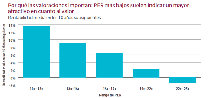 Abbiamo appreso che applicare un approccio di valutazione disciplinato è fondamentale per avere successo negli investimenti a lungo termine. Come si può vedere nel grafico sottostante, la valutazione è stata storicamente un buon indicatore per prevedere la redditività. Secondo le prove storiche, multipli PER iniziali bassi tendono a corrispondere a rendimenti futuri più elevati. Questo vale anche al contrario: multipli PER iniziali alti tendono a corrispondere a rendimenti futuri più bassi. Detto questo, a volte le valutazioni sono alte per i motivi giusti, e il nostro approccio fondamentale ci aiuta a determinare se un'azione è quotata al suo prezzo giusto.