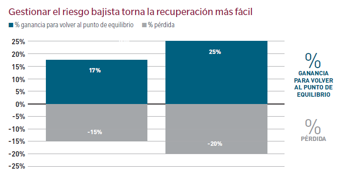 Le aziende di alta qualità con profitti sostenibili tendono a essere meno colpite durante le fasi ribassiste del mercato rispetto alle aziende di qualità inferiore. Guardiamo il grafico seguente. Se il mercato azionario subisce un calo del 20%, è necessario un rendimento del 25% per tornare al punto di partenza. Un portafoglio che perde il 15% durante lo stesso mercato ha bisogno solo di un rendimento del 17% per recuperare le sue perdite.