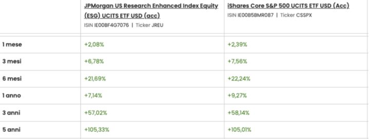Uno schema simile si riscontra anche con il JPMorgan Global Research Enhanced Index Equity (ESG) UCITS ETF, che mira a sovraperformare l’MSCI World. Qui la dinamica è quasi speculare: una performance in linea o leggermente superiore al benchmark su orizzonti lunghi, e un margine più stretto, a volte negativo, nel breve termine.