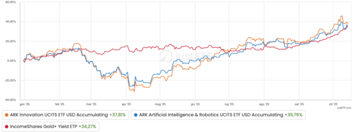 Tra i migliori ETF per performance da inizio anno spiccano due prodotti firmati ARK Invest, pioniera della gestione attiva tematica: ARK Innovation UCITS ETF, che investe in società globali legate a intelligenza artificiale, genomica, fintech, automazione e robotica; ARK Artificial Intelligence & Robotics UCITS ETF, focalizzato su imprese che beneficiano della diffusione dell’AI e della robotica industriale.