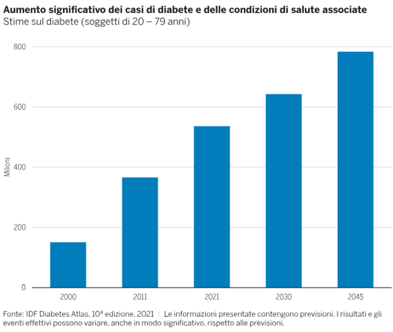 Il settore alimentare sta attraversando una profonda trasformazione e vediamo emergere importanti opportunità in società di ingredienti alimentari ancora poco valorizzate, destinate a trarre vantaggio dall’aumento significativo – e probabilmente duraturo – dei casi di diabete (Grafico 1), che continuerà a stimolare innovazione e domanda.