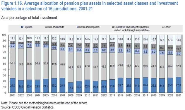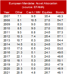 I Paesi offrono gradi di flessibilità diversi per l'allocazione di capitale in asset privati. Ad esempio, alcune giurisdizioni hanno ancora restrizioni o divieti sugli investimenti immobiliari. Tuttavia, la proporzione degli asset pensionistici allocati in investimenti alternativi nei principali Paesi dell'OCSE è aumentata dal 11,5% nel 2001 al 18,6% nel 2021 (vedi grafico qui sotto). I dati EFAMA sui mandati giungono alla stessa conclusione: gli asset alternativi sono passati dal 7,1% dell'AUM nel 2007 al 20,5% nel 2021 (tabella qui sotto). Questa traiettoria ascendente richiede un maggiore controllo normativo per garantire un monitoraggio efficace dei rischi.