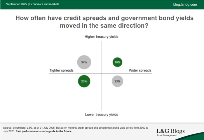 A questo punto, qualcuno potrebbe obiettare che quest’ultima rimane comunque una buona protezione contro il rischio di credito, ma anche questa affermazione può essere oggetto di dibattito. La nostra analisi degli spread mensili e dei rendimenti dei Government bond dal 2002 fino a luglio 2025 ha mostrato che nel 42% dei casi questi due parametri hanno avuto lo stesso andamento.