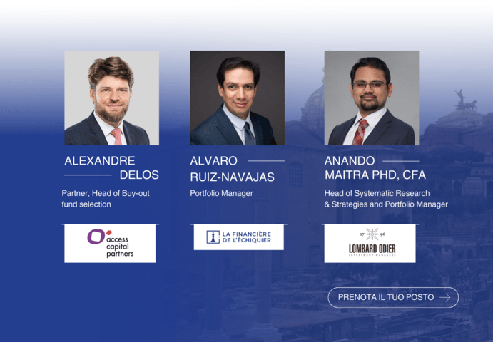 Durante questa colazione con professionisti ti due ore a Roma, riservata ai selezionatori di fondi e agli acquirenti di fondi, i partecipanti avranno l'opportunità di conoscere le strategie di investimento di Access Capital Partners, Lombard Odier Investment Managers, La Financière de l’Echiquier: la mattina inizierà con una piccola colazione per favorire il networking, e successivamente ogni gestore presenterà la propria strategia per mezz'ora. Alla fine dell'evento ci sarà una sessione di domande da parte dei partecipanti della durata di 15 minuti.