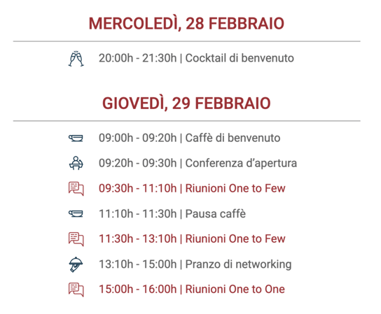 Durante la giornata del 29 febbraio, che inizierà con un caffè di benvenuto e una conferenza inaugurale, si terranno due tipi di incontri tra i gestori dei fondi e i selezionatori e acquirenti: