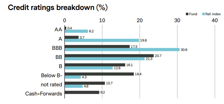 Es un fondo con una calidad crediticia menor que su benchmark, jugando más al High Yield que al Investment Grade, lo que lo hace un producto bueno para protegerse de subida de tasas, jugando a la compresión de Spread si el crédito elegido tiene un buen Balance sheet.