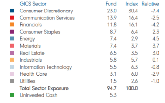 Las alocaciones en sector o geografía son las que usualmente revelan la naturaleza activa de los fondos, o su tilt a un determinado estilo de inversión. En este caso, se puede ver que el fondo tiende a subponderar aquellos sectores más relacionados con el estilo growth (Inf. Tech, Cons. Discretionary) y a sobreponderar aquellos de estilo más value (Energy, Material). Llama la atención Financials, pero debe ser algo más relacionado con las compañías específicas más que con el sector propiamente tal.