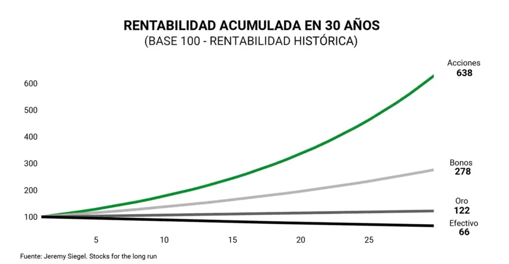 La evidencia muestra que invertir en activos reales, especialmente en acciones, es la mejor opción para hacer crecer nuestros ahorros a largo plazo.