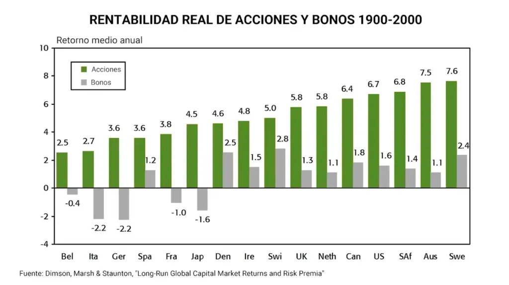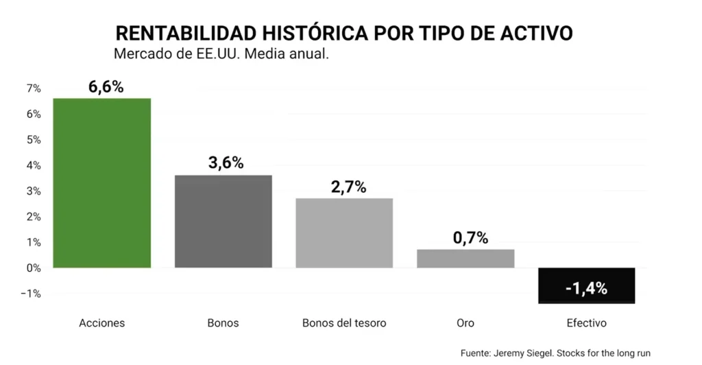 Durante este período, la inversión en acciones demostró una rentabilidad real anual del 6,6%, frente al 3,6% de la inversión en bonos. En contraste, no invertir en absoluto y mantener el dinero en efectivo habría significado una pérdida del 95% de su valor debido a la inflación.