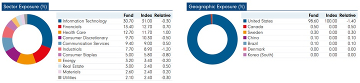 En cuanto al breakdown de composición del portafolio en cuanto a regiones y sectores, se puede ver que el Fidelity Sustainable Research Enhanced US Equity UCITS ETF no dista excesivamente de su índice de referencia, aún cuando el ETF es de gestión activa y no intenta replicarlo.